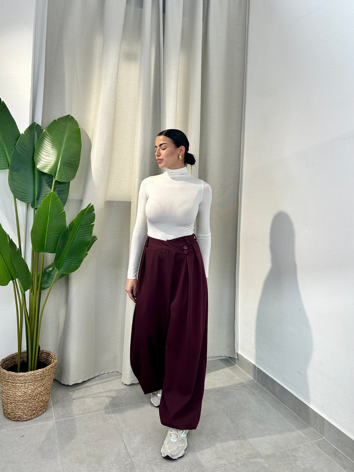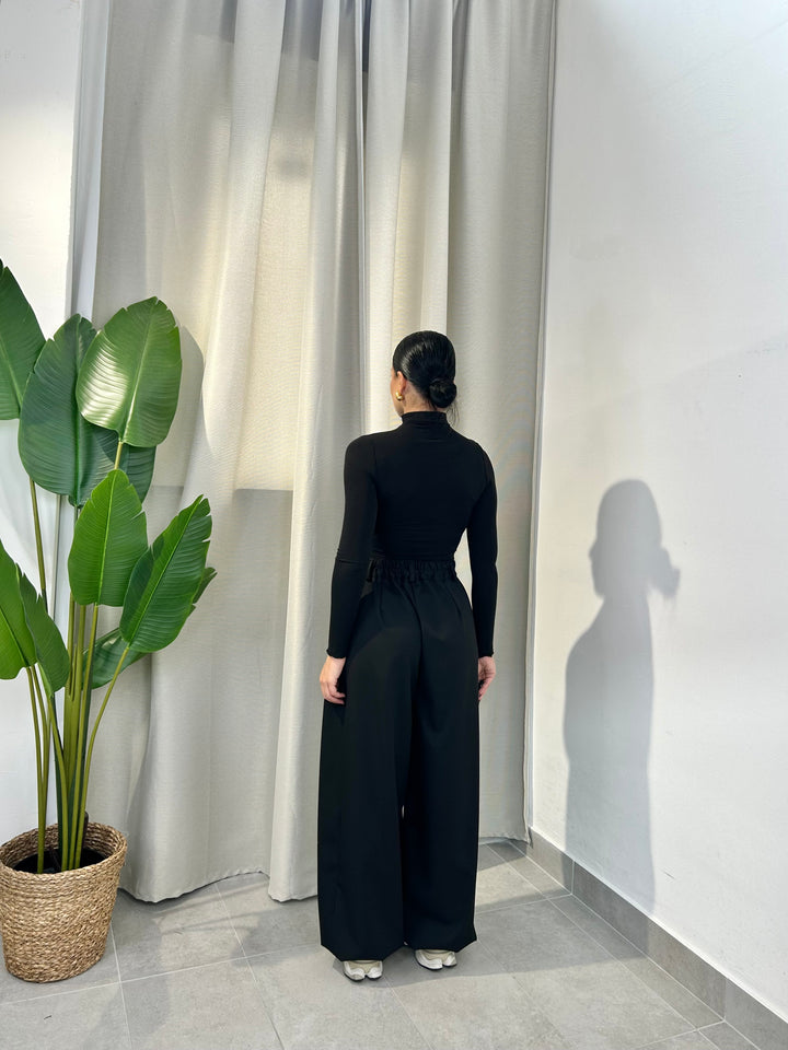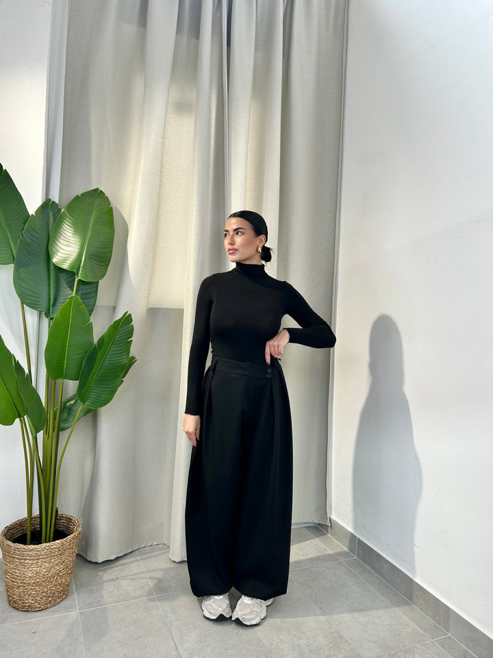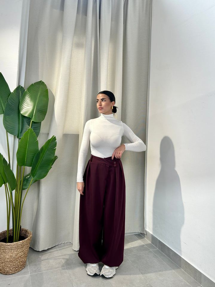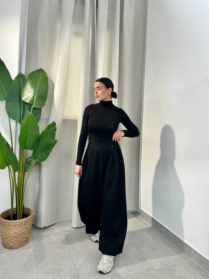 -Pantalone palazzo con abbottonatura trasversale ed elastico sul retro;