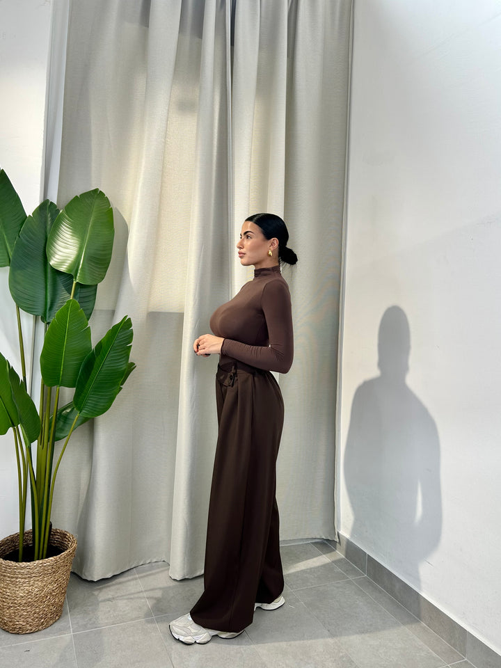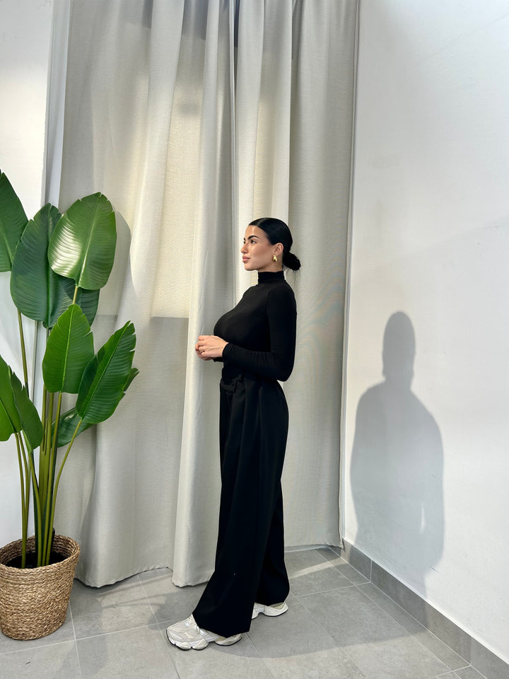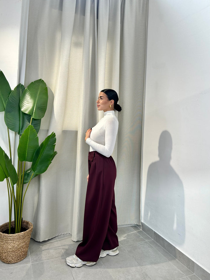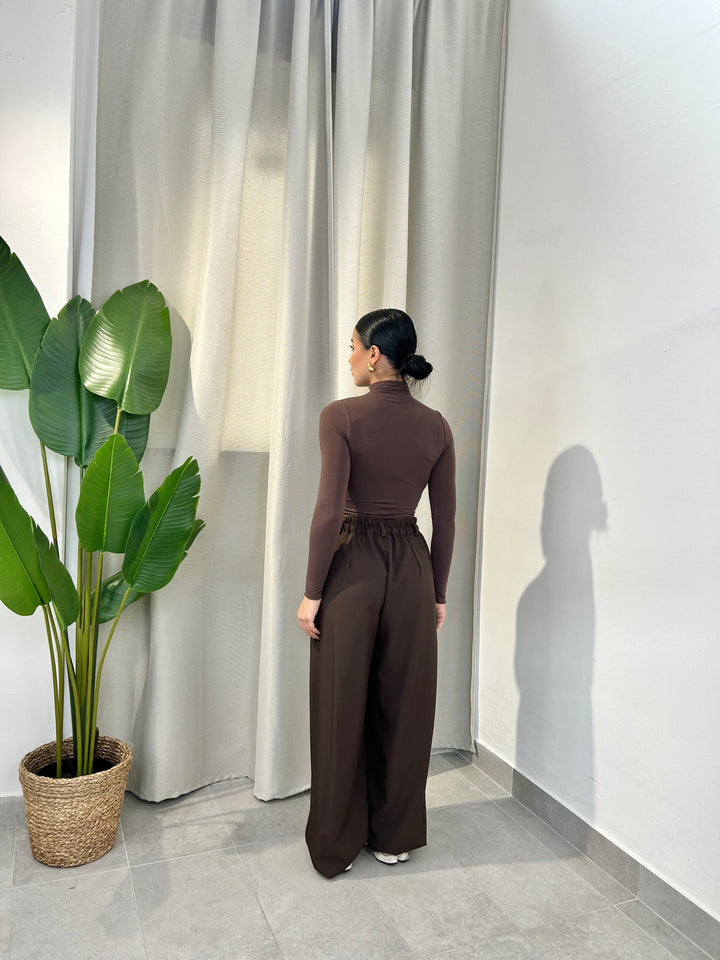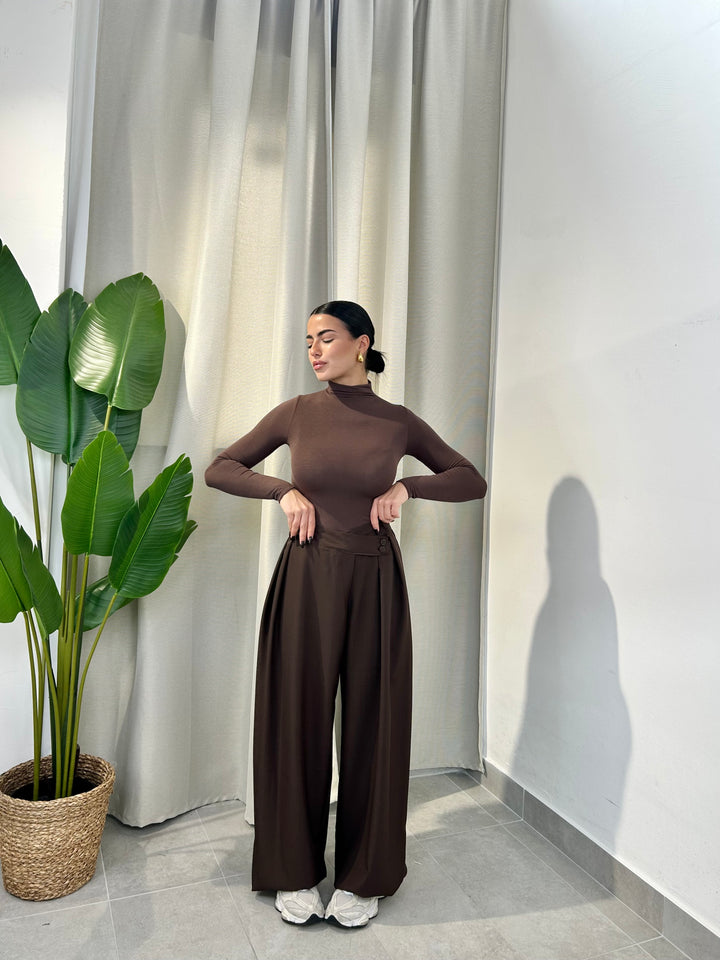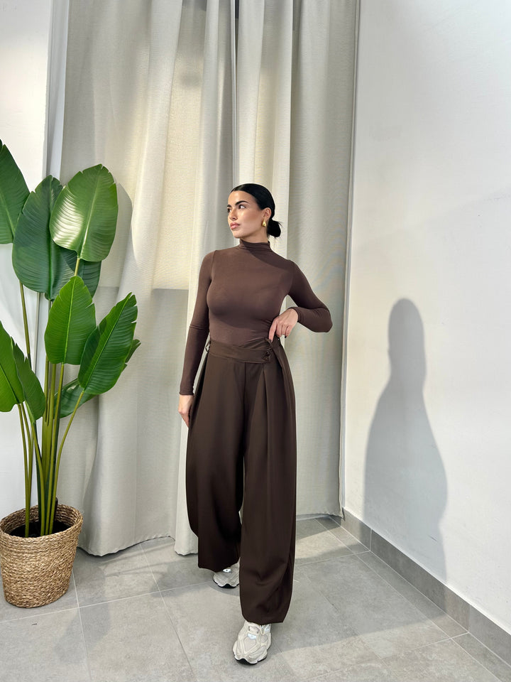 -Pantalone palazzo con abbottonatura trasversale ed elastico sul retro;