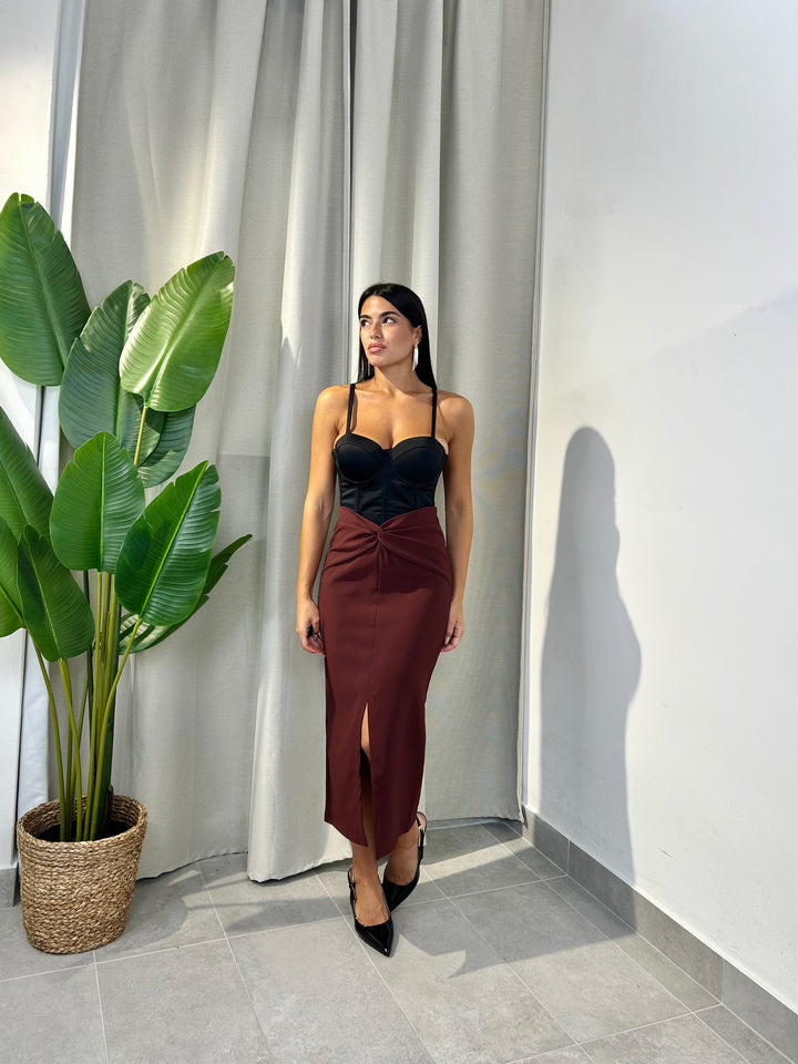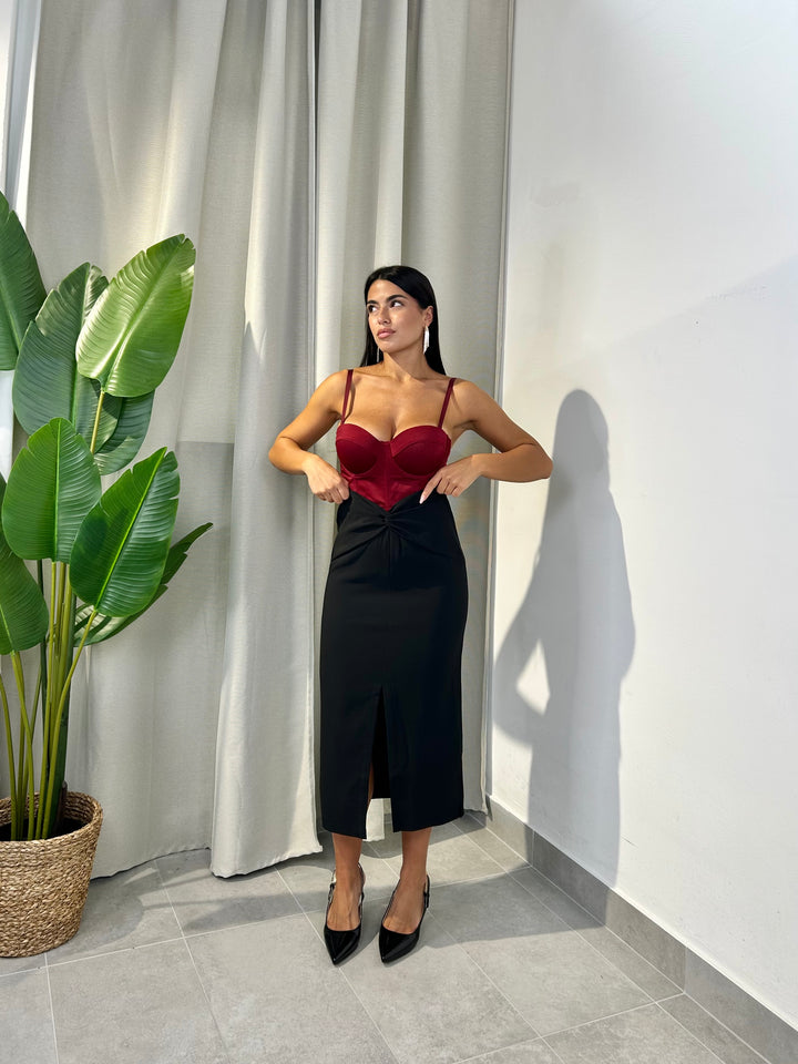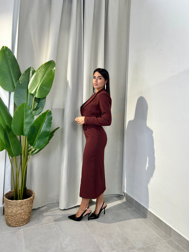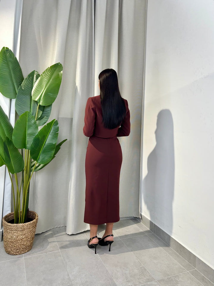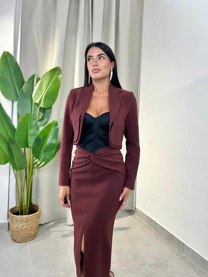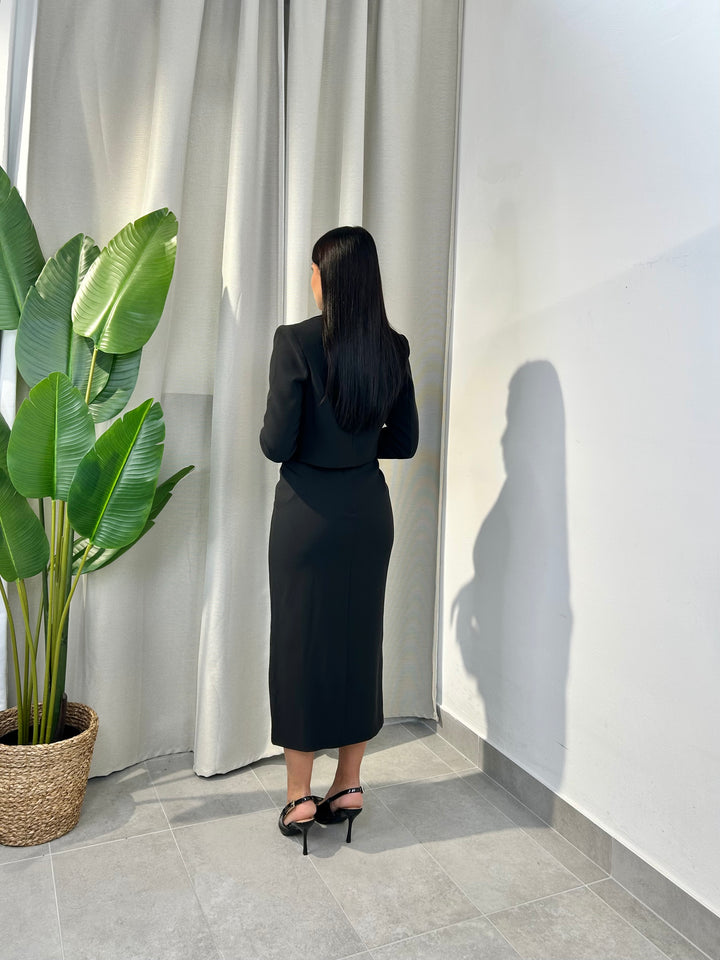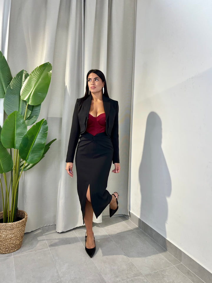 -Tailleur composto da Bolerino crop monopetto+Longuette con nodo e spacco centrale;