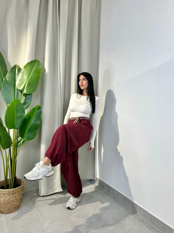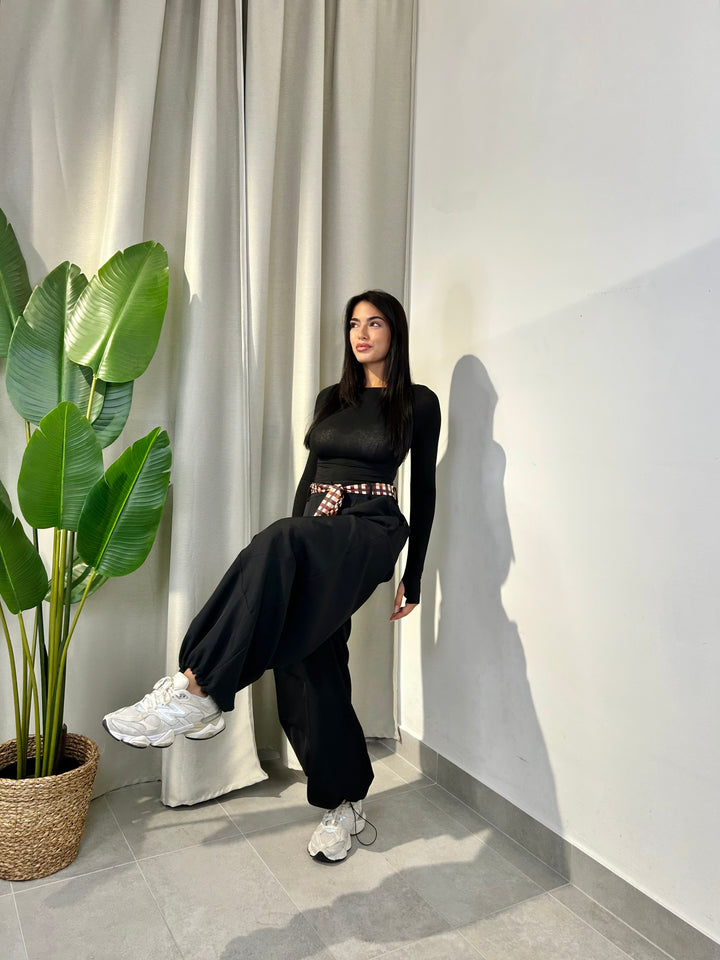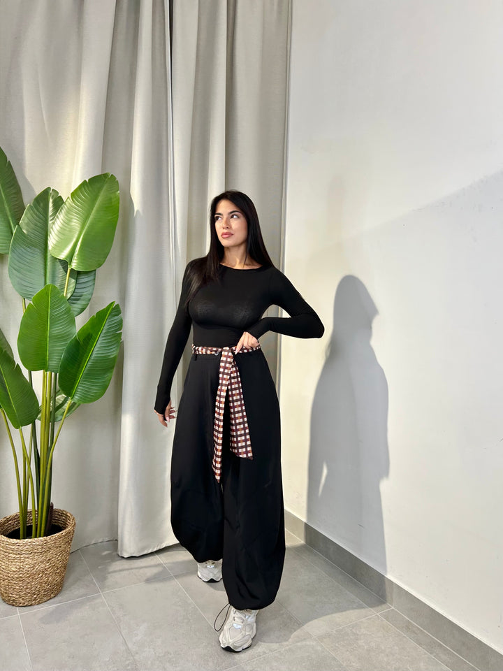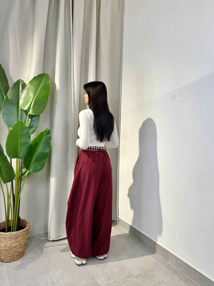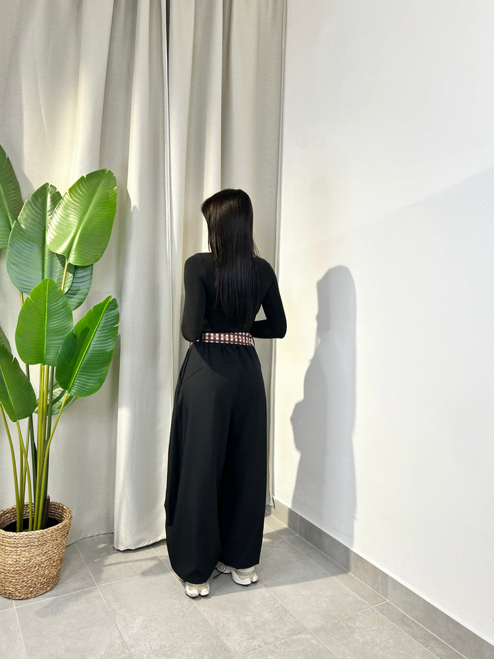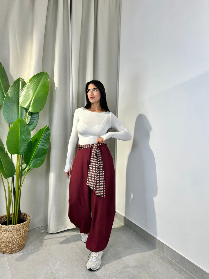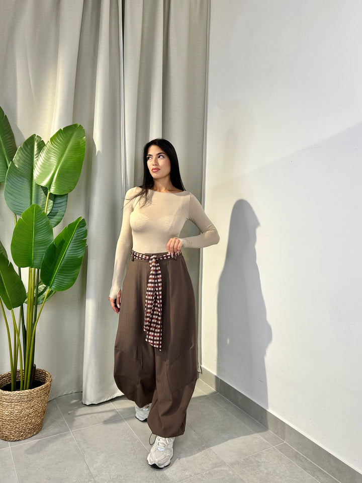 -Pantalone modello ballon con coulisse sul fondo regolabile e compreso di foulard a fantasia;