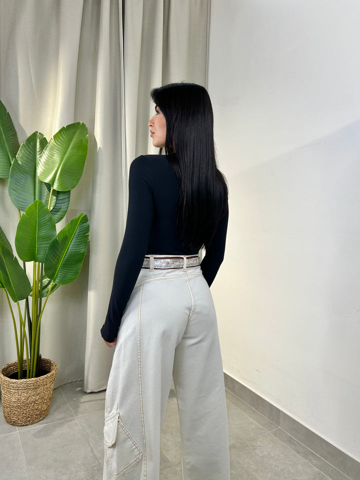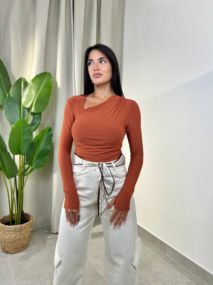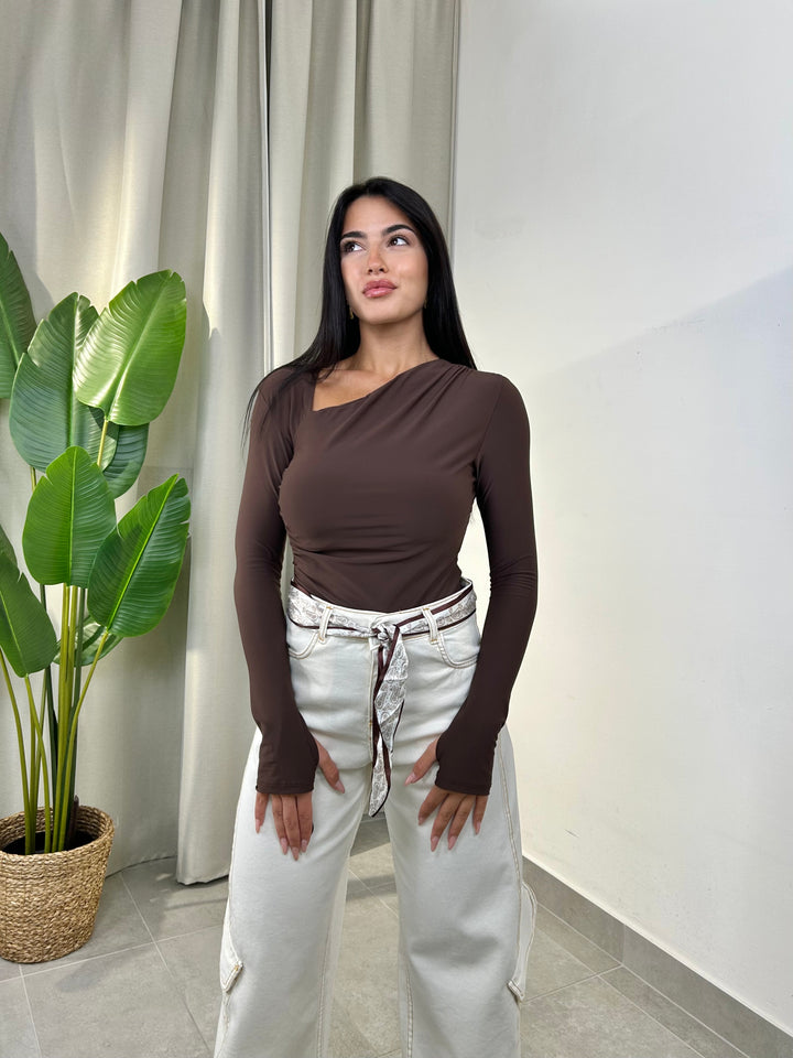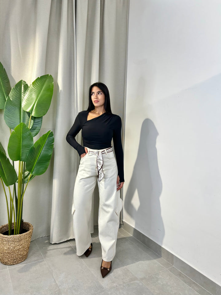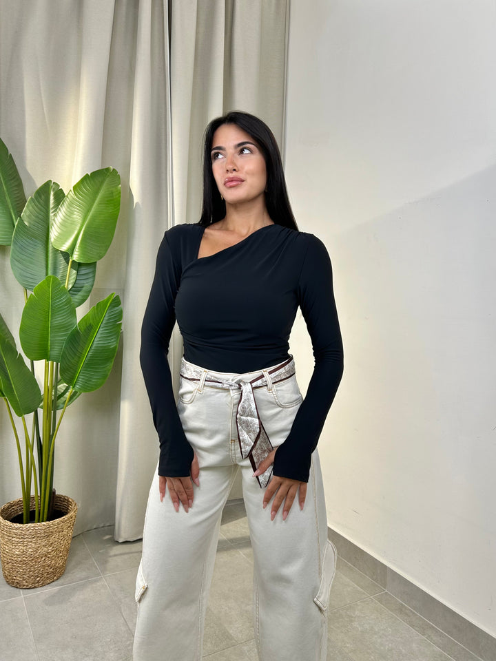 -Body in lycra con scollo trasversale e drappeggio laterale;Manica a guanto;