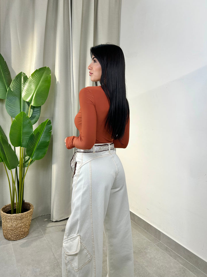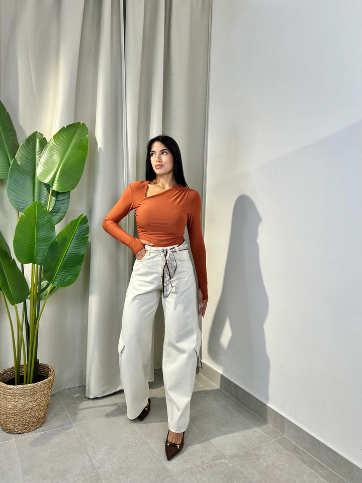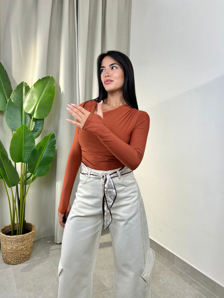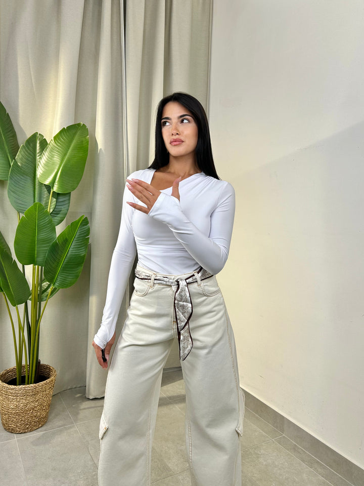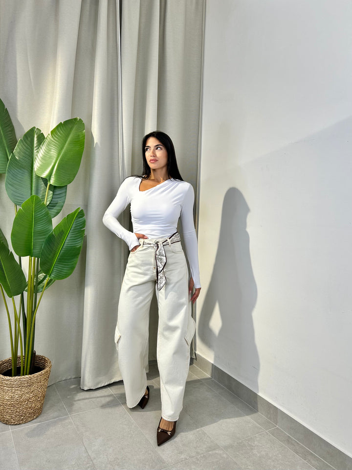 -Body in lycra con scollo trasversale e drappeggio laterale;Manica a guanto;