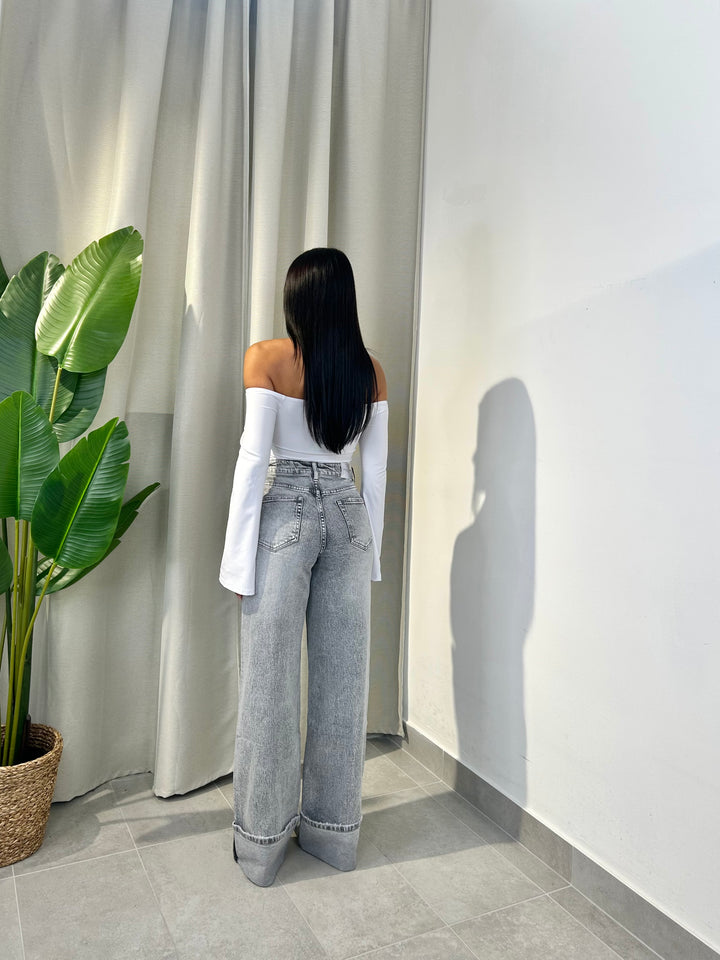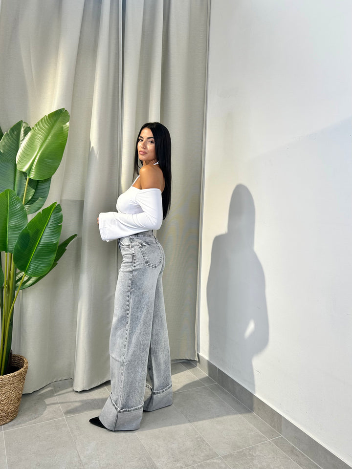 -Jeans grigio vita alta con piegone cucito sul finale in tela ferma;