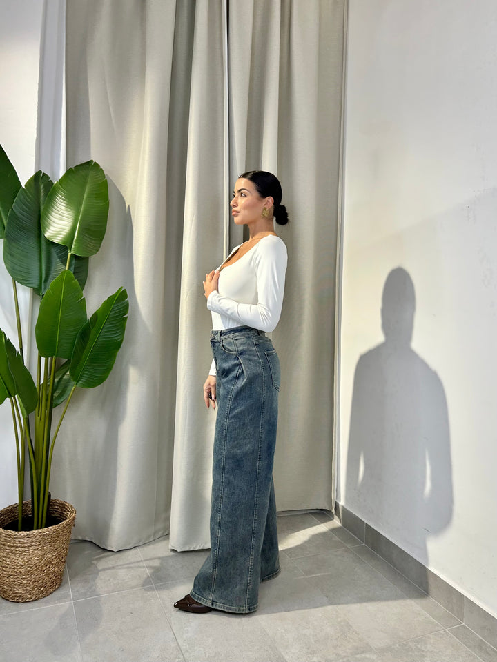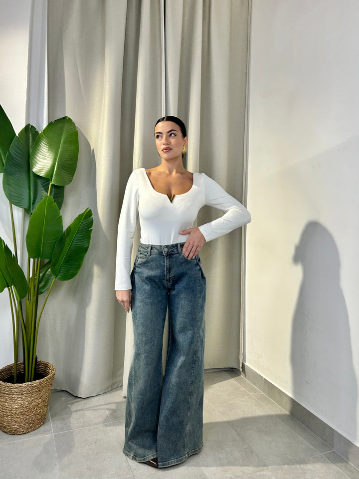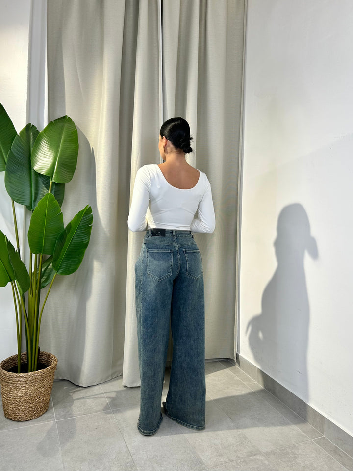 -Jeans Mod.Palazzo con pence laterali; Lavaggio sabbiato e tela elasticizzata;