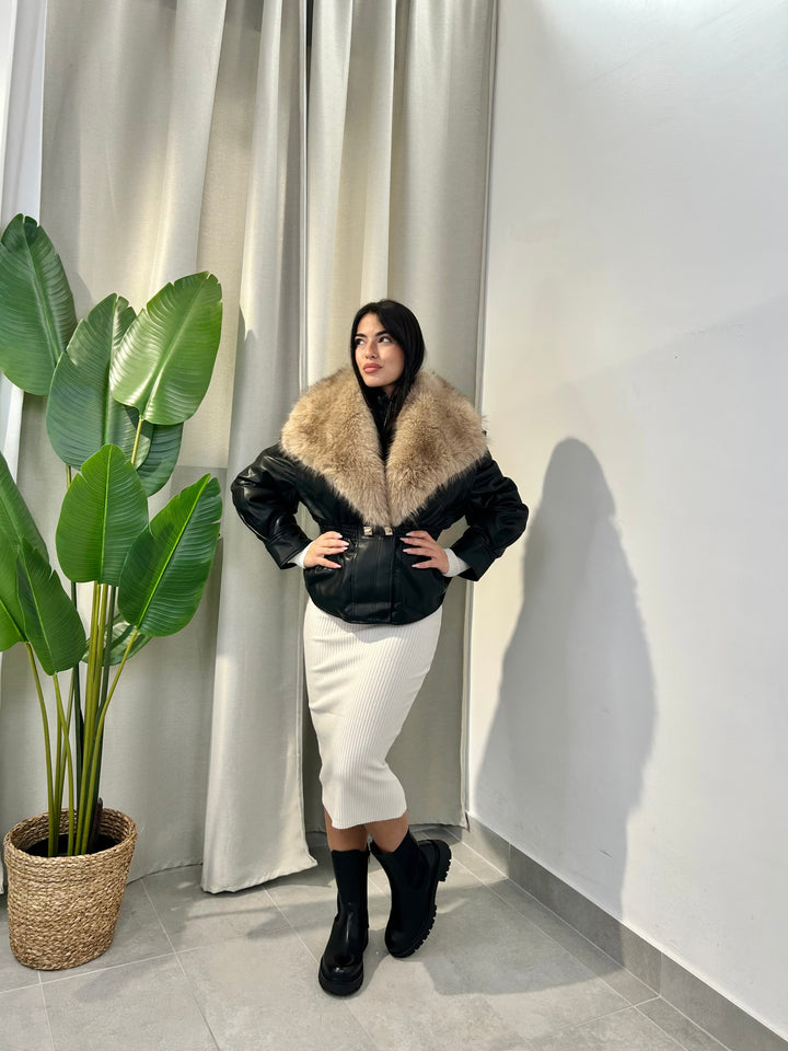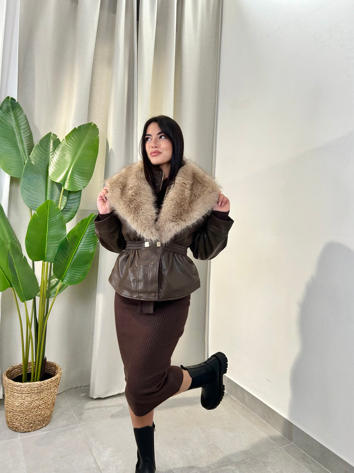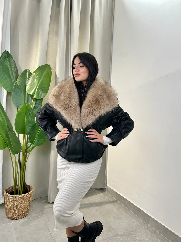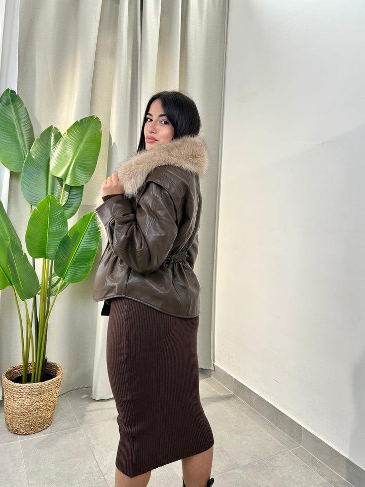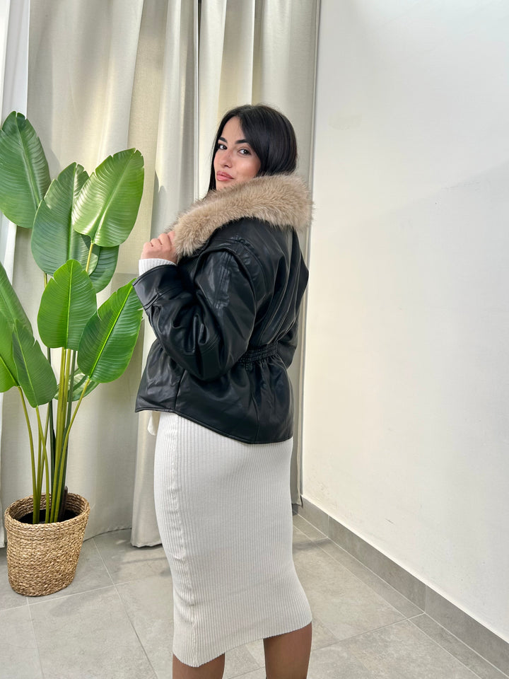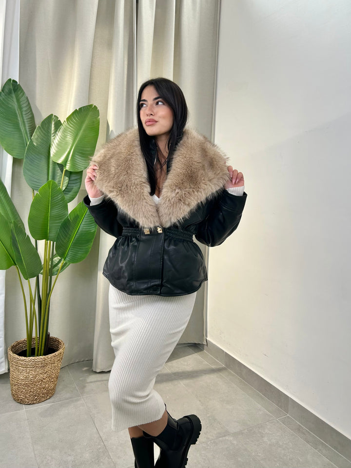 -Giubbotto in ecopelle con drappeggio in vita; Collo di ecopelliccia removibile e interno foderato con Ecopelliccia;