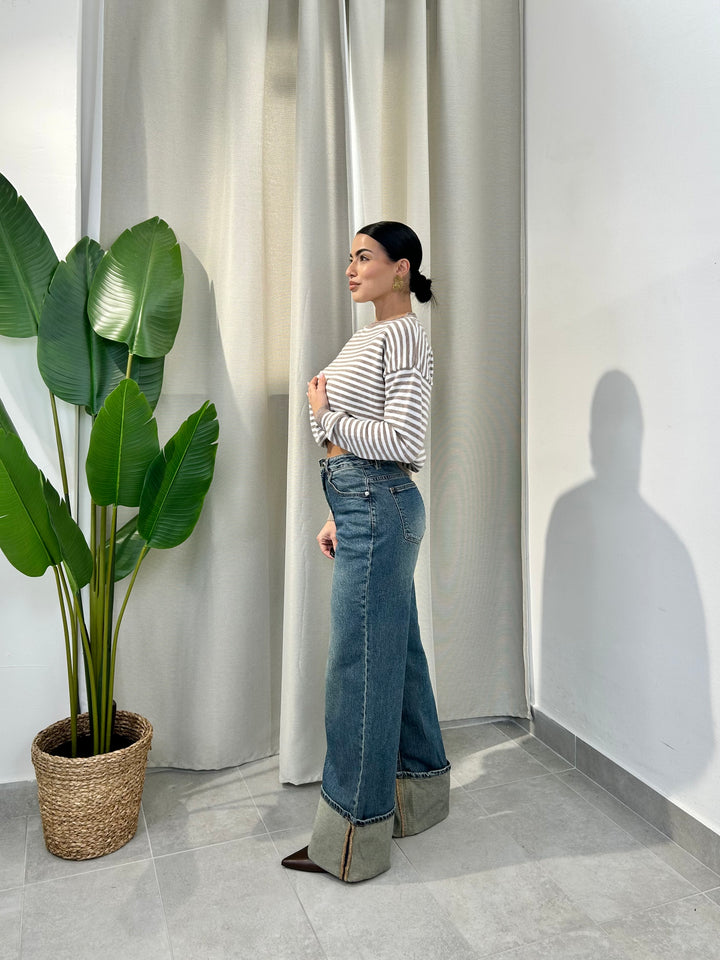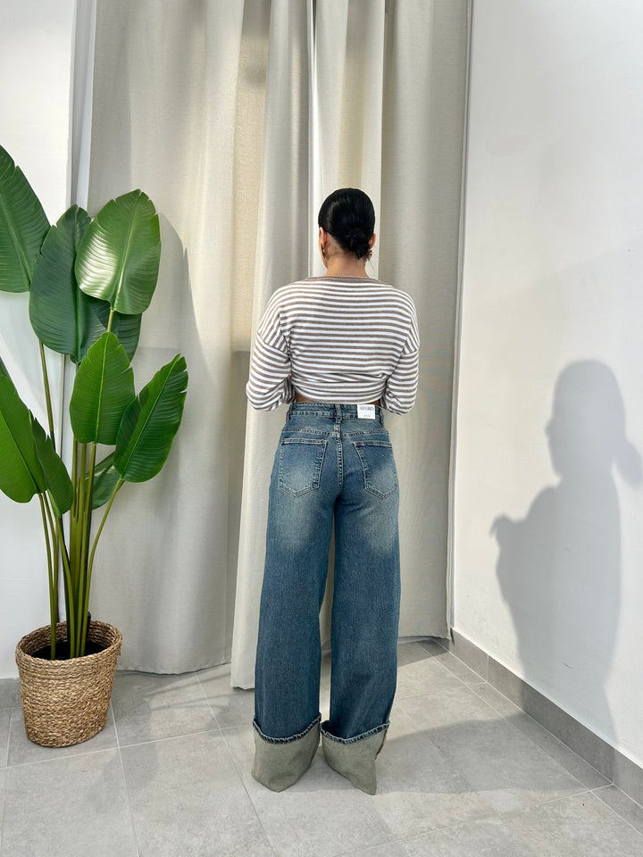 -Jeans sabbiato con piegone cucito sul fondo Mod.Palazzo in tela elasticizzata;