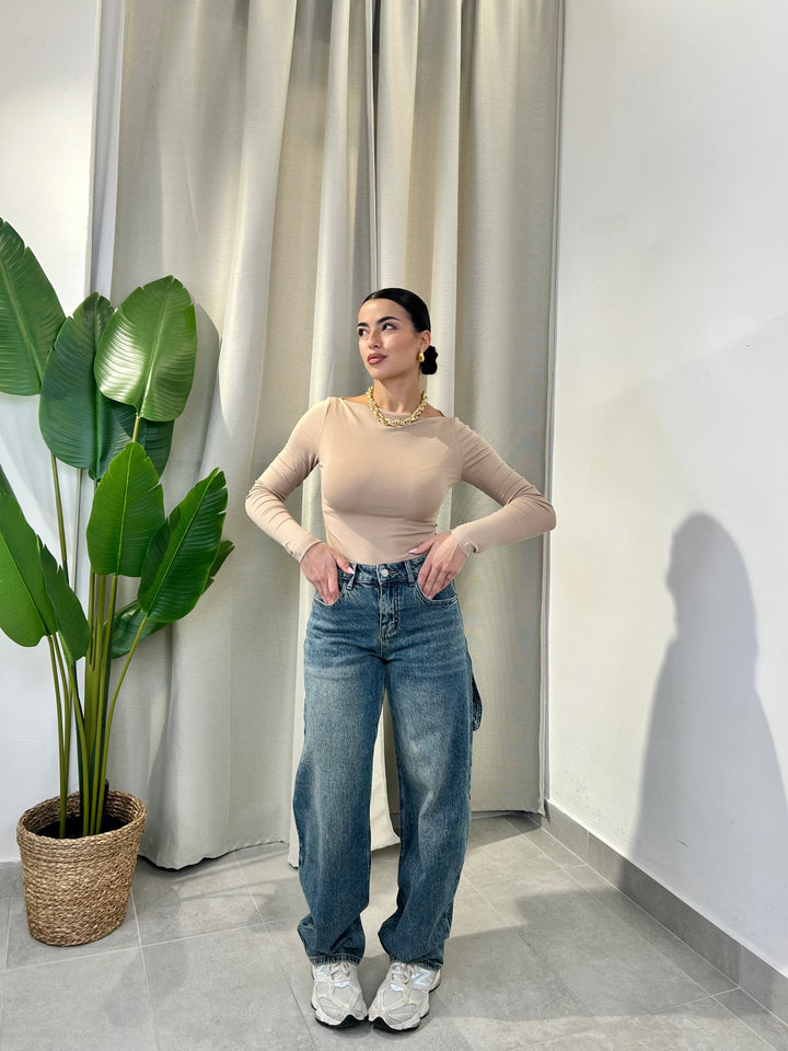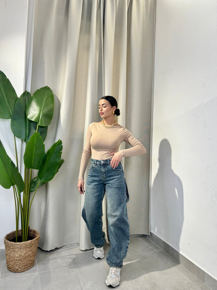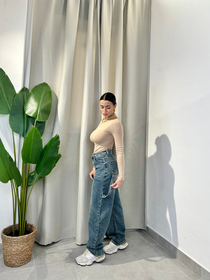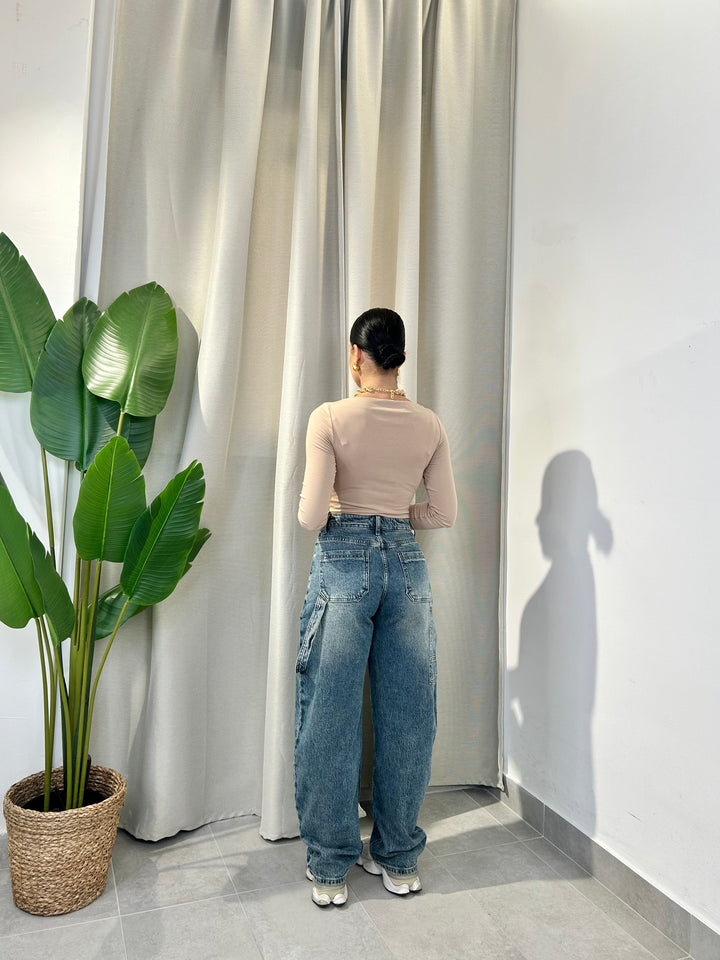 -Jeans Mod.Wide Ballon effetto sabbiato in tela ferma;