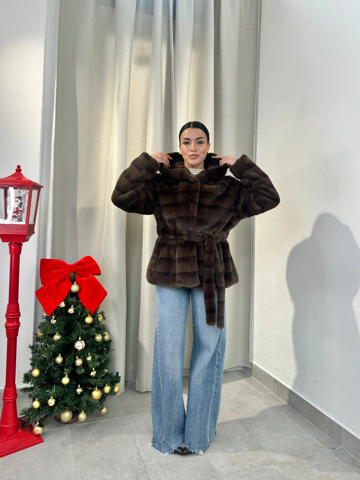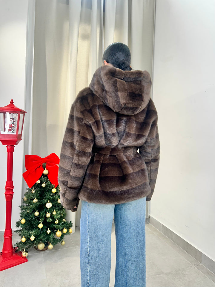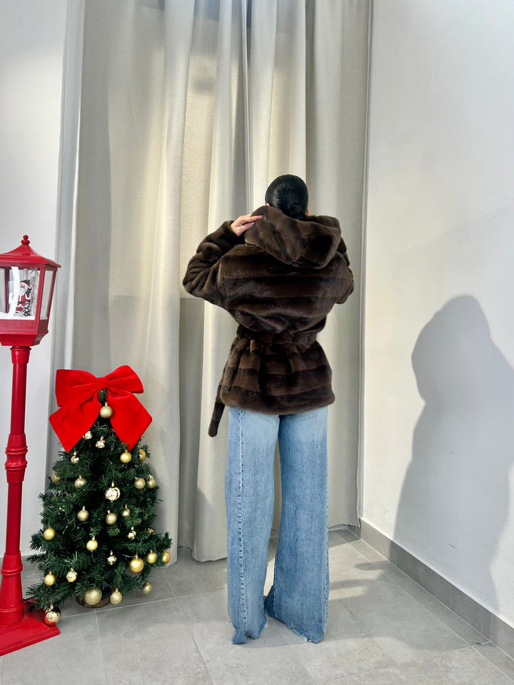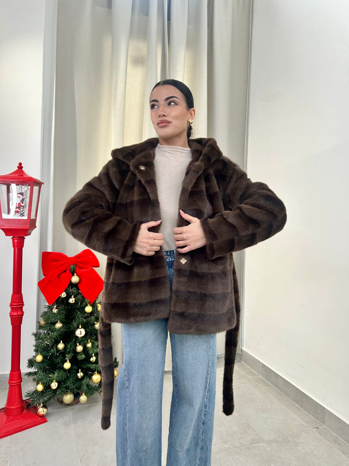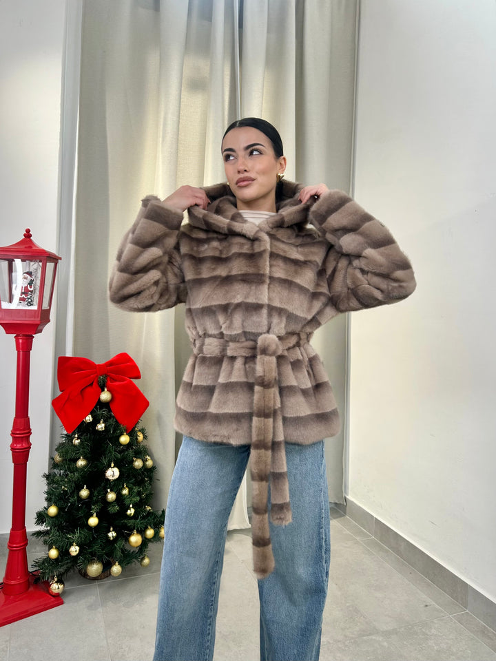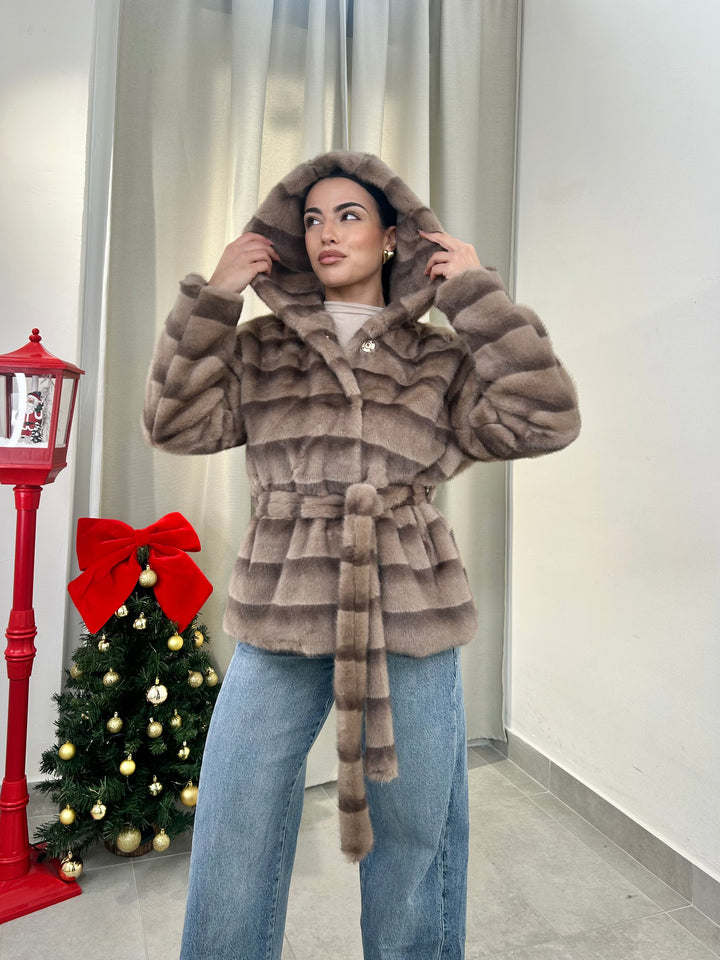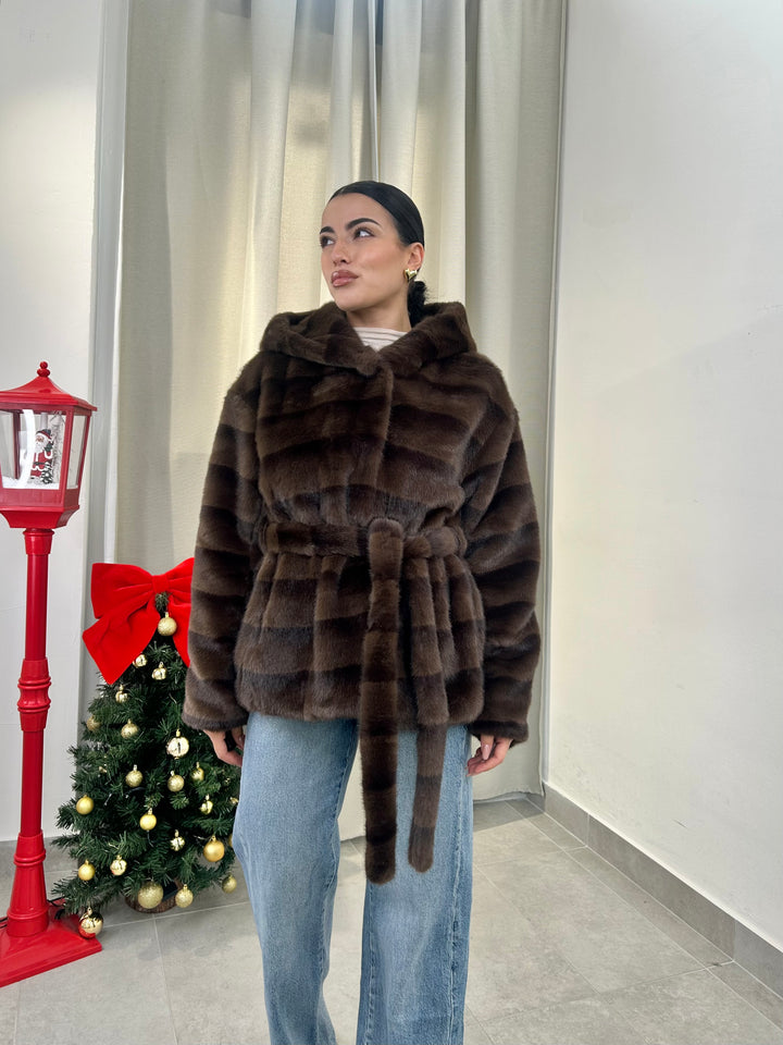 -Ecopelliccia Mod.Visone con cappuccio e fusciacca in vita; Interno foderato;