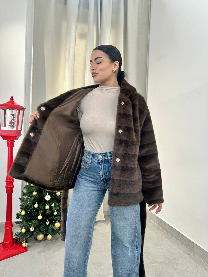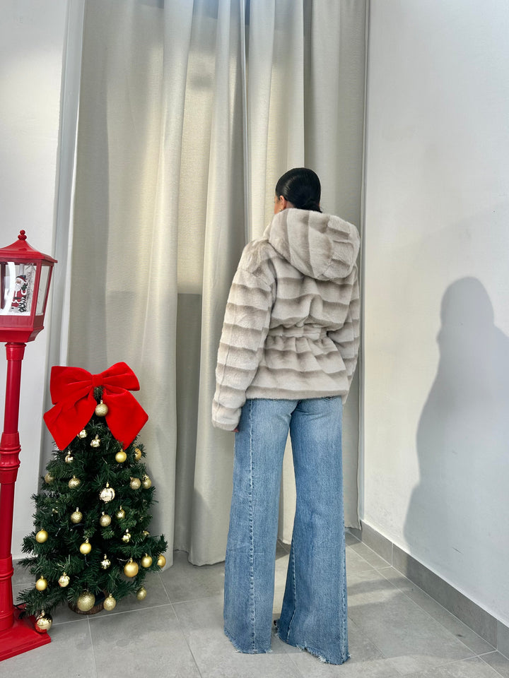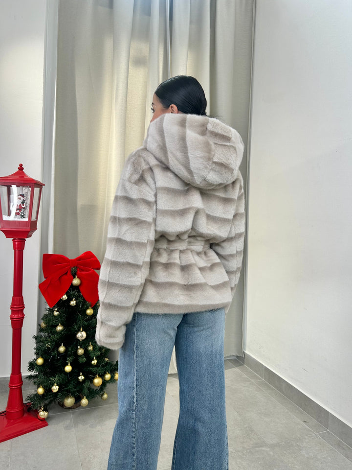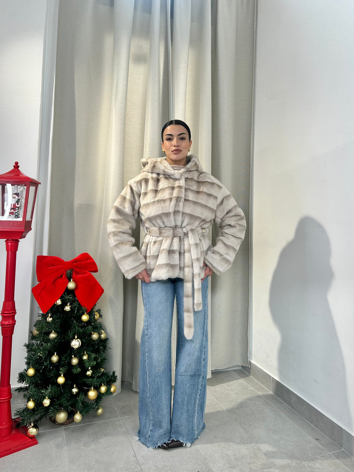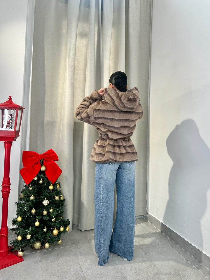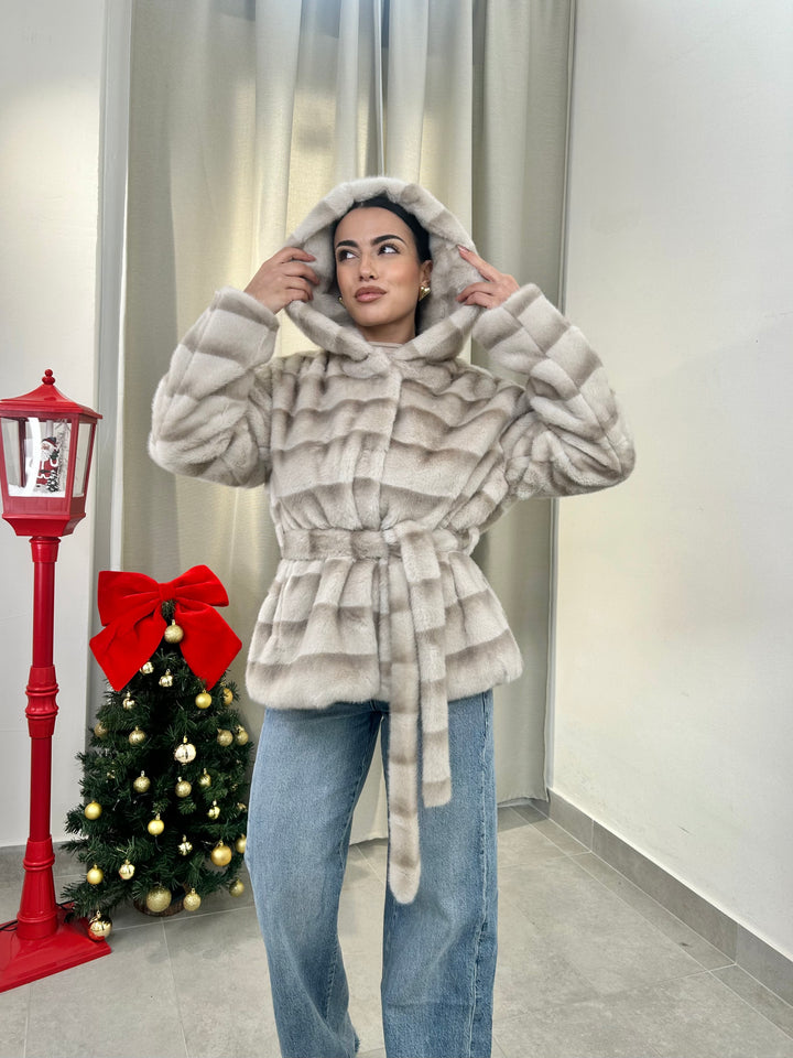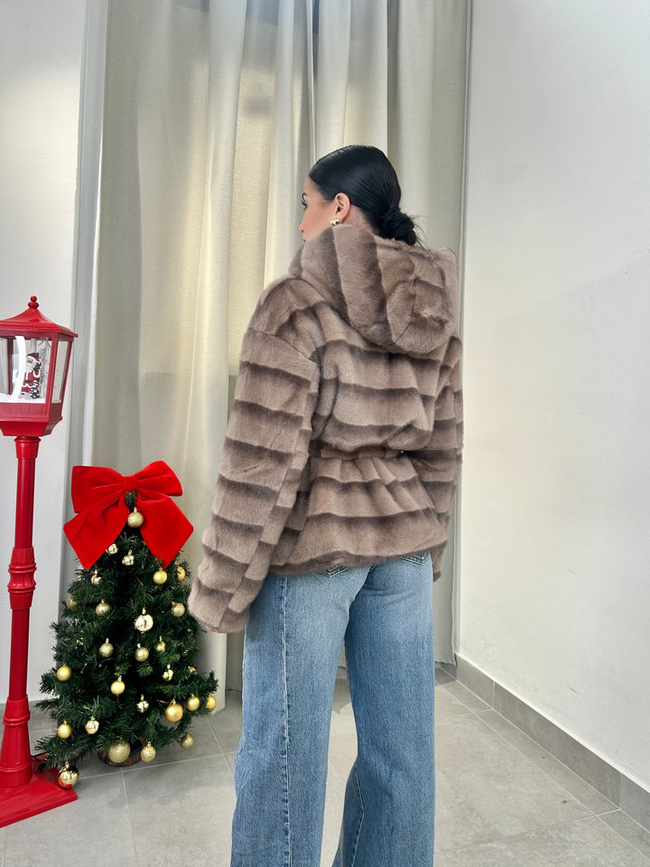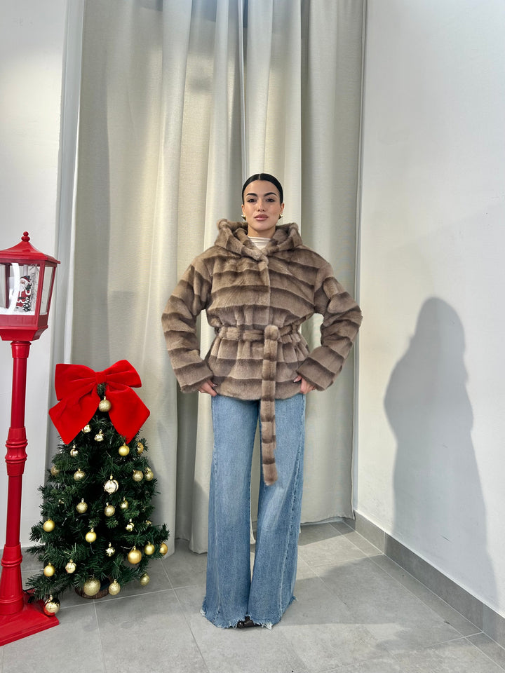 -Ecopelliccia Mod.Visone con cappuccio e fusciacca in vita; Interno foderato;